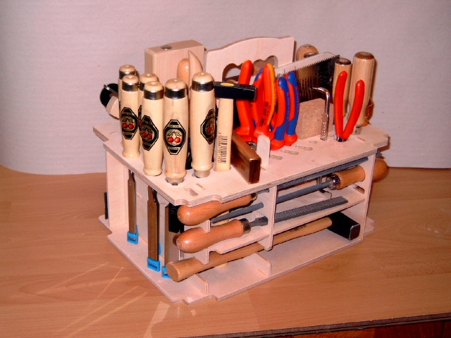 The MobiloBox is a well thought-out tool box for carrying, rolling or even hanging on the wall. Made of multiplex beech board with tool holders inside and painted transparent against moisture.