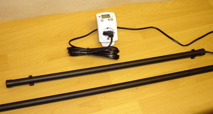 Ces tubes de chauffage d'un diamètre de 20 mm sont disponibles en 2 longueurs et les puissances qui en découlent. Longueur 600 mm avec 25 watts et longueur 920 mm avec 38 watts. Montage à l'aide de 2 pinces de fixation à une distance minimale de 10 mm des autres éléments. Pour que le ou les thermoplongeurs ne soient allumés qu'en cas de besoin, le raccordement 230 V est effectué via un régulateur de prise avec réglage libre de l'humidité relative.