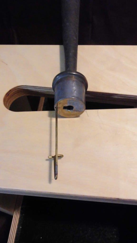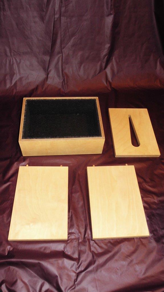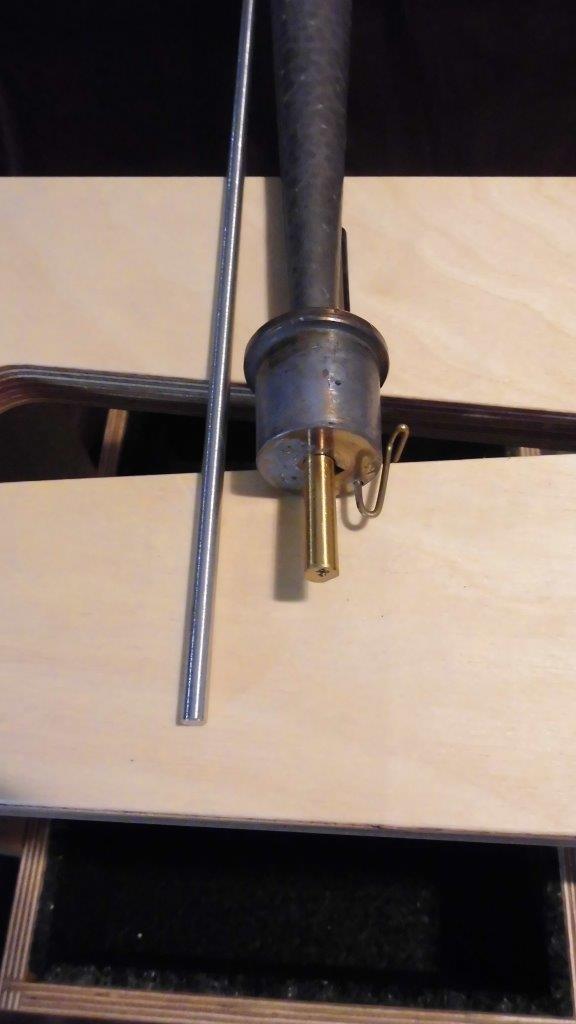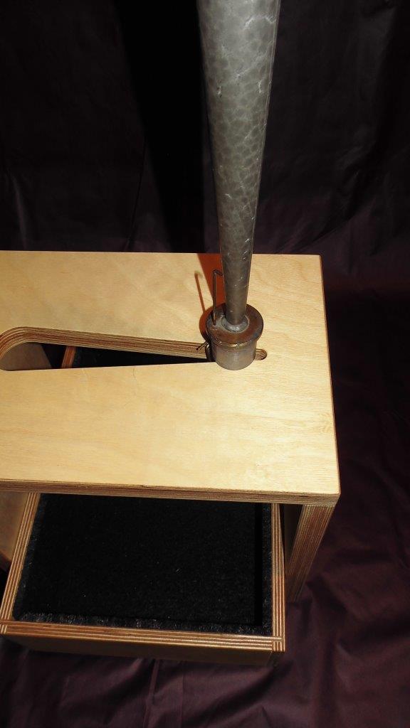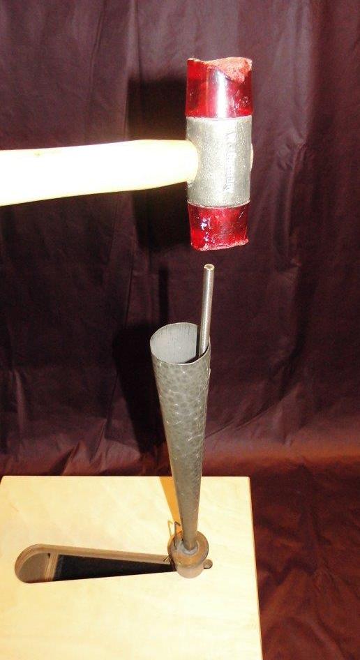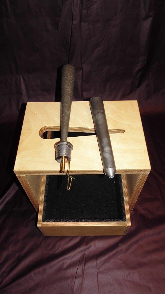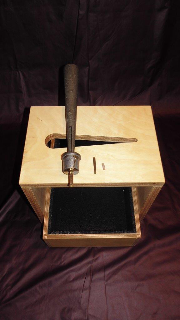Der stabile Bock aus Furnierplatte mit V-förmigem Durchbruch für die verschiedenen Kehlendurchmesser und passender Auffangkiste, ist die Grundlage für ein rationelles und schonendes Trennen der Kehlen von den Nüssen. Als Austreiber stehen verschiedene zyl. Metallstifte mit den Durchmessern 6/8/10/12/14/16/18/20 und 25 mm zur Verfügung. Damit auch Kehlen in Nüsse erreicht werden, die einen aufgelöteten Schaft oder bei kleineren Zungen einen eingelöteten Becher haben, sind die Austreiber mit versch. Verlängerungen über Gewinde bis ca. 1300 mm verlängerbar. Weiter stehen 2 aufschraubbare Griffstücke für die Durchmesser ab 10 mm zur Verfügung.