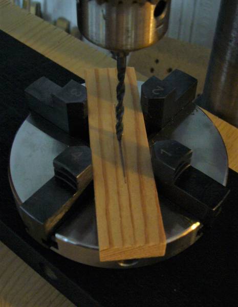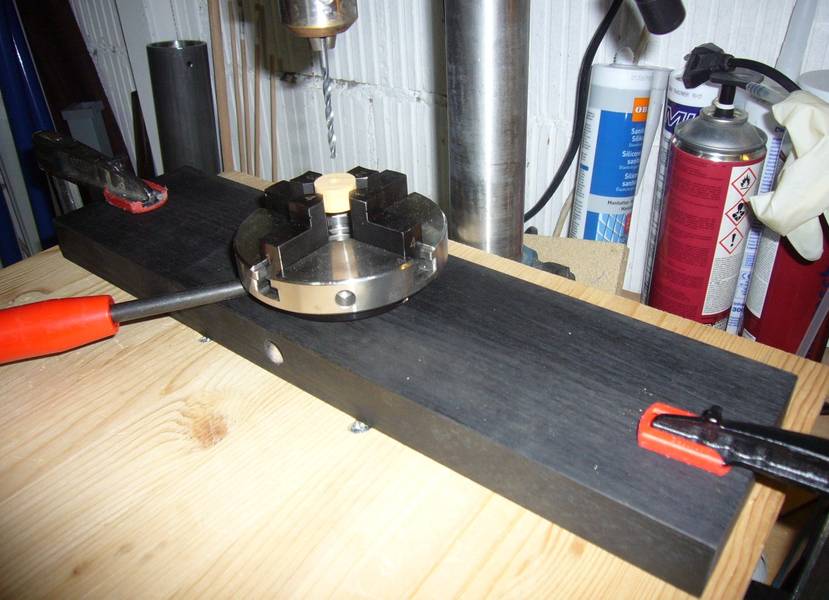 Vorrichtung besteht aus einem 4-Backen-Spannfutter zum Aufspannen auf den Tisch der Ständerbohrmaschine. Ideal für das Bohren von größeren Leder- oder Holzmuttern, Mechanikteilen, Stirnbohrungen von Stechern (lange Stecher können nach unter den Tisch durchgesteckt werden), alle Größen von Kegelventilen usw. Aber auch Wippen und Holzmechanikteile können für immer exakte Mittenbohrungen mittels der gegenläufigen Backen gespannt werden.