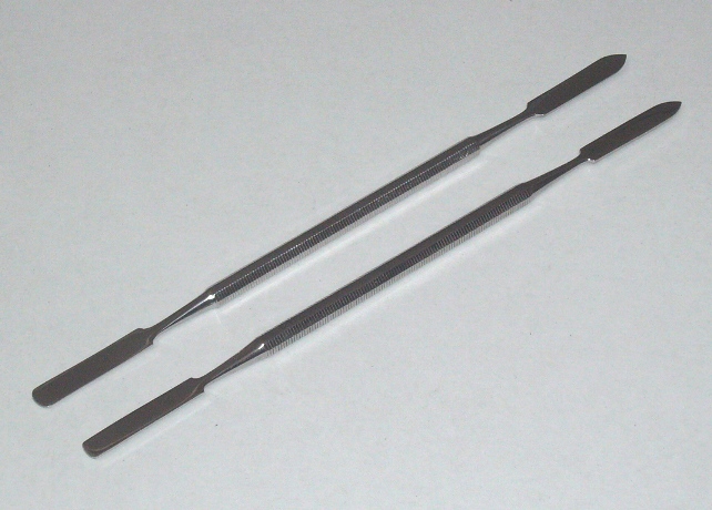 Paar stabile verchromte Spatel, spitz dünn auslaufend mit runden Kanten. Für verschiedene Einstellarbeiten an Metallpfeifen geeignet.